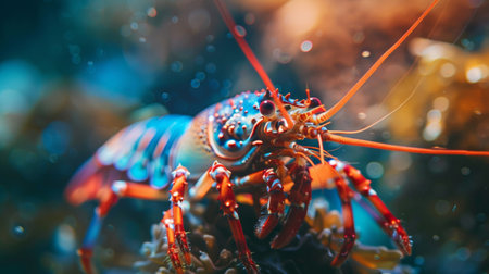 A close-up of a vibrant lobster underwater, showcasing its colorful exoskeleton and antennae against a dreamy bokeh background. The image captures the beauty of marine life in stunning detail.