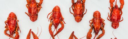 panoramic shot of red lobsters on white background