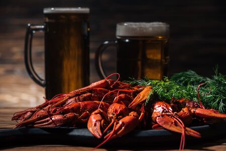 Boiled red crawfish on the wooden surface against a mug of beer background. Closeup, selective focus, toned,
