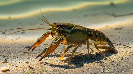 Crawfish Exploring a Shallow Stream During Daylight, Showcasing Vibrant Colors and Intricate Details in a Natural Setting. Generative AI