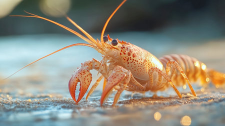 A vibrant lobster perched on rocky terrain, illuminated by gentle waves. This stunning image captures the intricate details of the lobster's shell and claws, showcasing marine wildlife in its natural habitat.