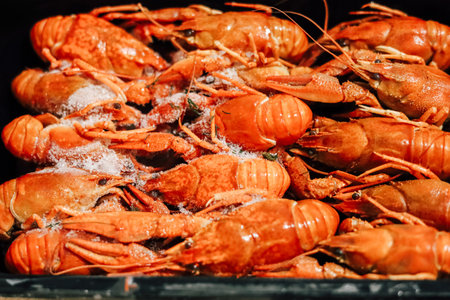 A vibrant display of reddish brown crustaceans seasoned and prepared for enjoyment at a bustling seafood festival.