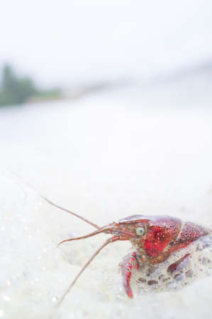 Crawfish full of foam at polluted river. selective focus