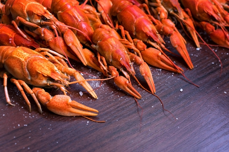 Crawfish cooked and served on wooden background