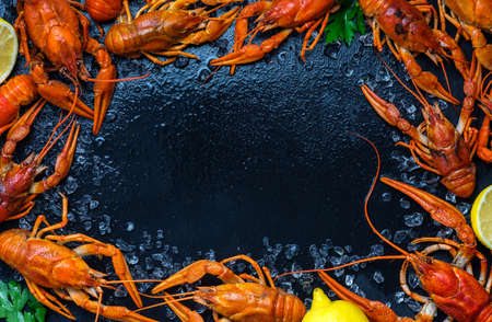 Fresh boiled crawfish with lemons and greens on a dark table with ice. Copyspace for text. Top view.