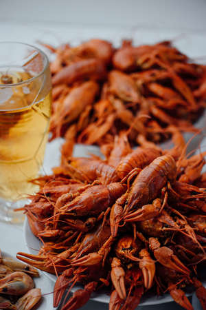 two large white plates with boiled crawfish, boiled shrimps and glass of beer on a light background