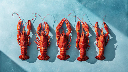 Five cooked crawfish line up against a vibrant blue backdrop, casting long shadows
