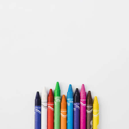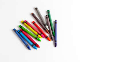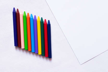 children's multi-colored wax crayons for drawing on a white landscape sheet with free space for text on the right side. Left hand drawing concept