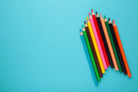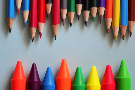 A colorful pile of crayons and pencils on a blue background. The crayons and pencils are of various colors and sizes, creating a vibrant and playful scene. Concept of creativity and imagination