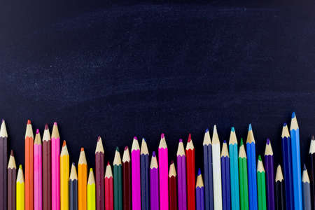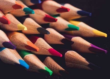 Abstract background for creativity. Lots of colored pencils on a dark background. Sharp tips of wooden pencils.