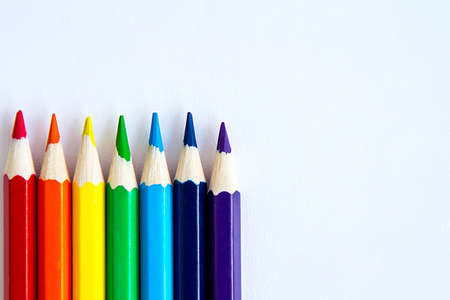Different colored pencils lined up in different colors with white background for school and arts with copy space for free text. Horizontal