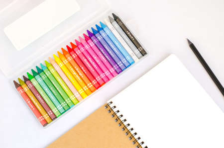 Blank drawing book with black pencil and colorful box set of crayons on white background