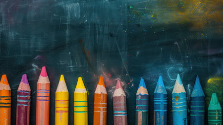 A row of sharpened colored pencils of various hues stands ready on a dark blue chalkboard, the surface dusted with traces of past creations. The pencils' vibrant tips hint at the possibility of new drawings and artistic expressions.