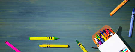 Banner with messy aasortment color drawing pencils close-up, art background web design concept photo
