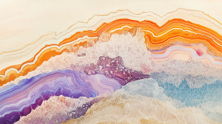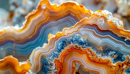 Vivid colors and intricate designs of agate create an abstract artwork highlighting the natural wonders of geology. Layers of blues, oranges, and browns merge seamlessly.