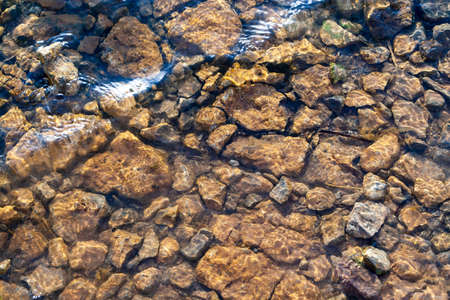 summer sunshine creates beautiful patterns on river stones under water. Nature shot
