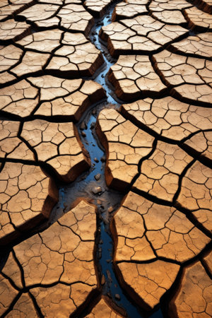 A breathtaking view of cracked earth revealing the impact of drought, where a glowing water stream reflects the warm hues of the sunset, showcasing the beauty of nature's resilience.