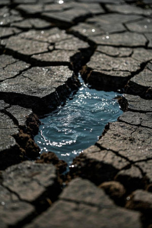 This striking image captures water pooled in cracked earth, showcasing the stark beauty of drought-affected landscapes. The reflection highlights environmental concerns.