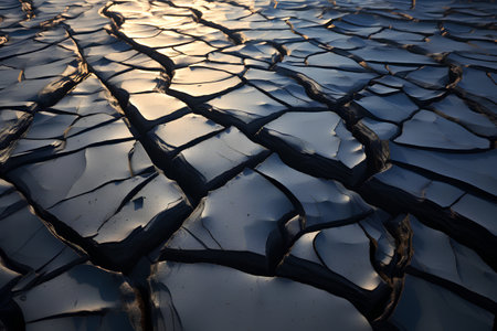 Natural cracks and fissures on arid terrain reveal an intricate pattern of dried earth with blue hues reflecting sunlight in a desolate landscape