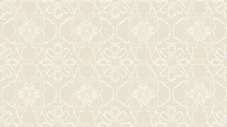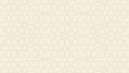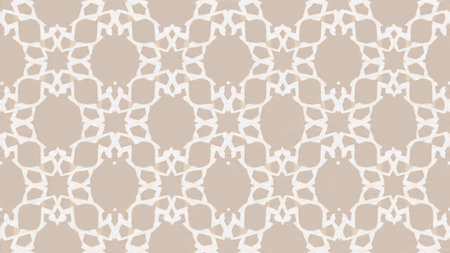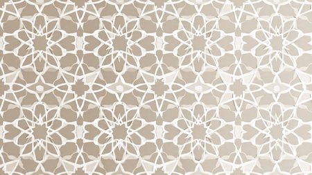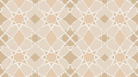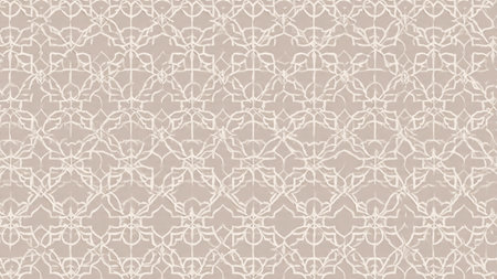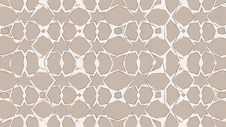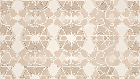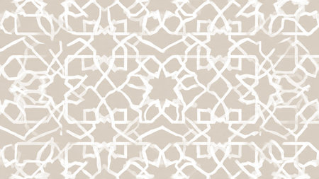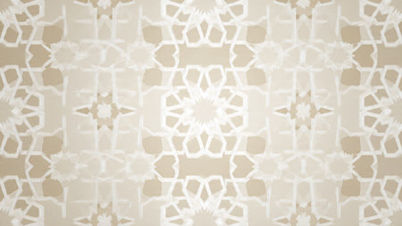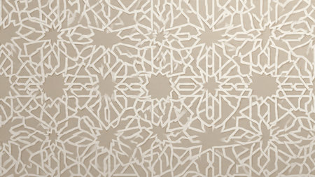 A soft and intricate Islamic geometric pattern in beige, cream, and light grey, showcasing repeating star and polygon motifs with a subtle texture.