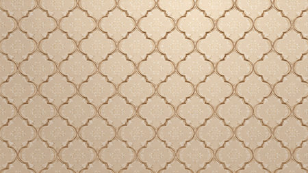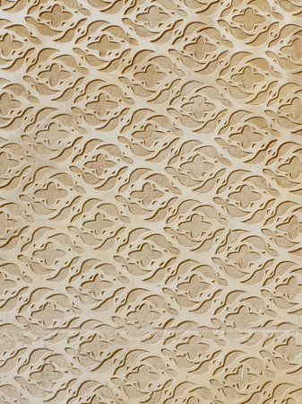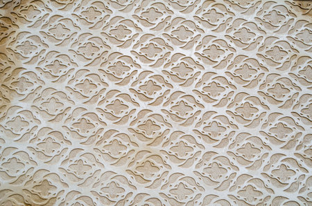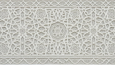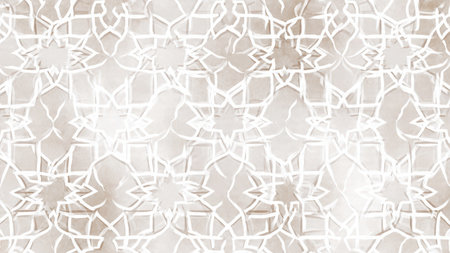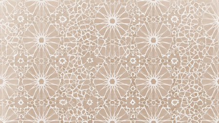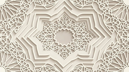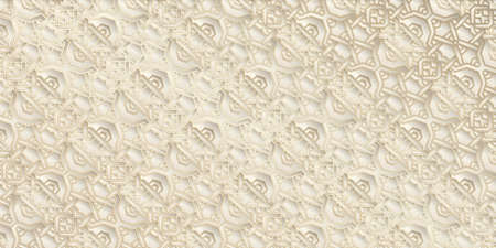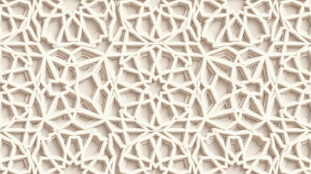 A detailed 3D relief of an intricate geometric Islamic pattern in beige and cream tones with soft lighting and shadows.