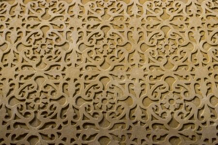 Detailed patterns created from wood show a skillful design, filling the space with a rich texture and repeated shapes in a warm color.