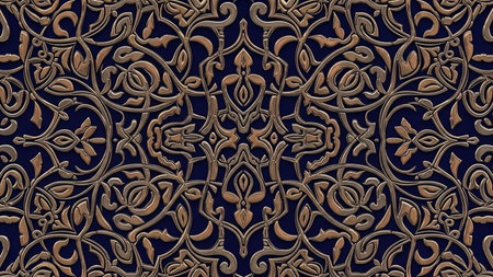 An intricate and ornate gold colored arabesque pattern with detailed floral motifs and swirling tendrils is set against a deep navy blue background.