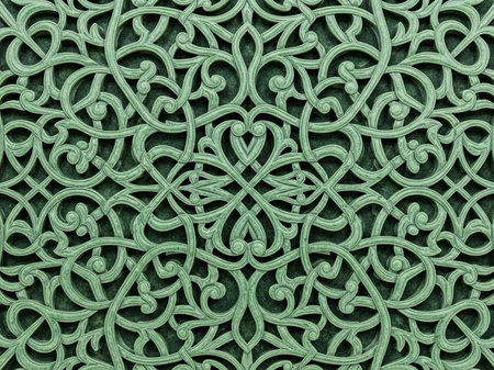 Intricate green metalwork pattern with swirling designs and shapes