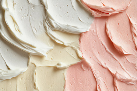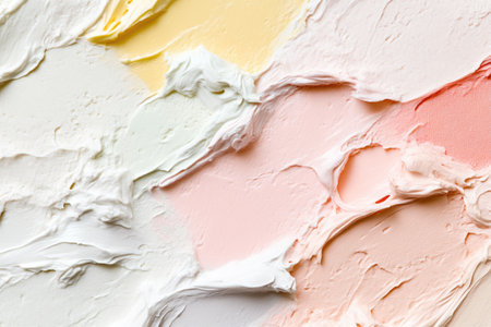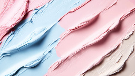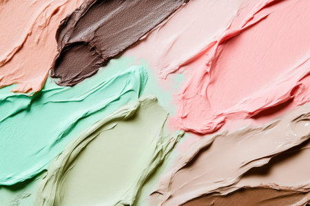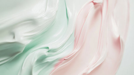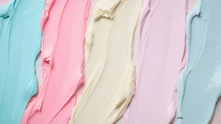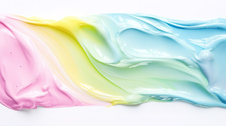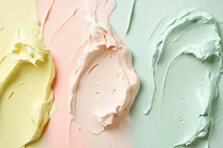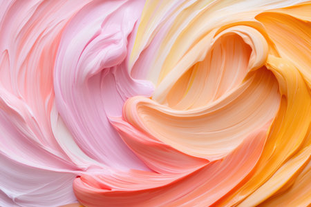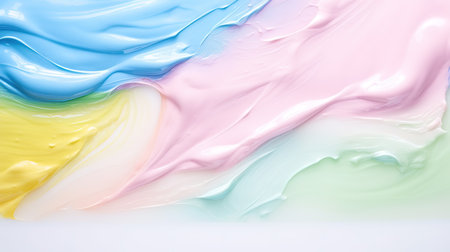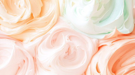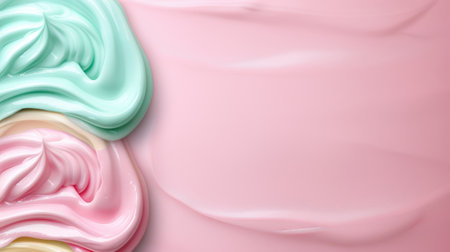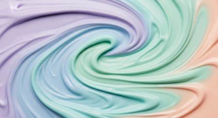 Gentle showing swirling pastel colored cream or cosmetic product in a close up down view with smooth textures and blended hues keywords: cream,...