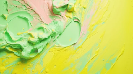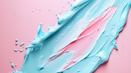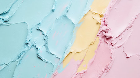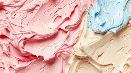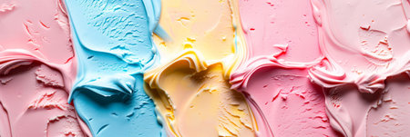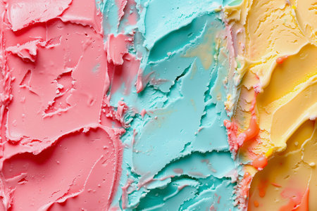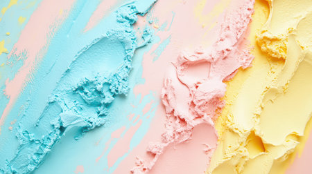 Whipped ice cream in blue pink and yellow is spread on a pastel background showcasing vibrant colors and creamy textures perfect for summer.