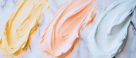 Swatches of cream displayed on a marble background in soft lighting and vivid colors