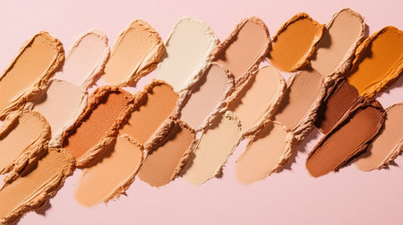 A stunning arrangement of foundation swatches in diverse shades on a soft pink background, showcasing the beauty of color variation and makeup artistry. Perfect for beauty and cosmetic applications.
