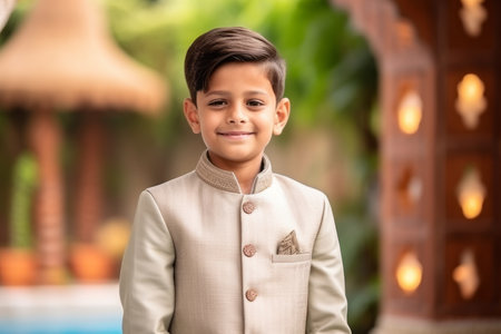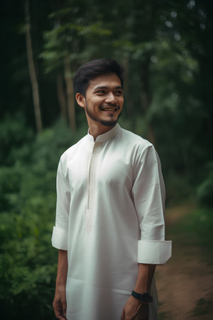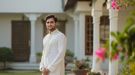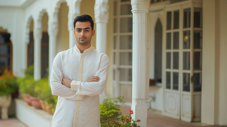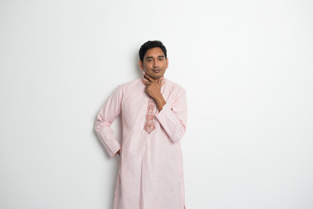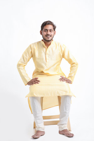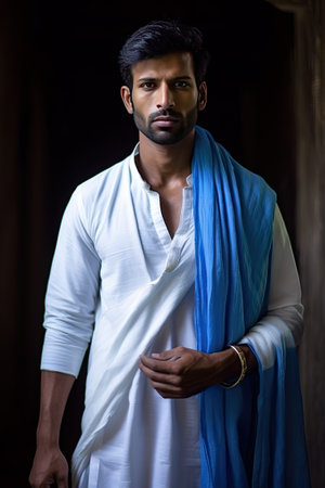 Handsome young Indian man in traditional Indian clothes posing outdoors