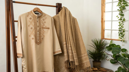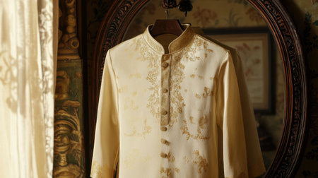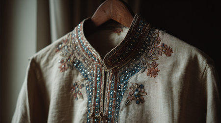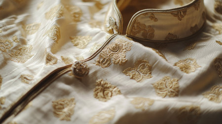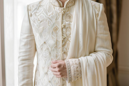 Closeup of traditional indian sherwani, a luxurious and elegant attire crafted with intricate embroidery and exquisite handwork, perfect for weddings and ceremonial festivities