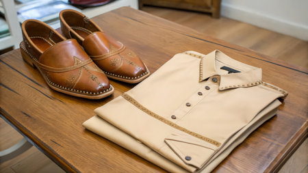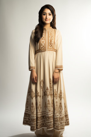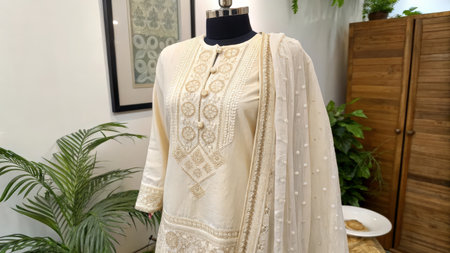 This stunning traditional attire showcases intricate embroidery in soft lighting, adding charm to any cultural event or celebration. Perfectly displayed in an elegant setting.