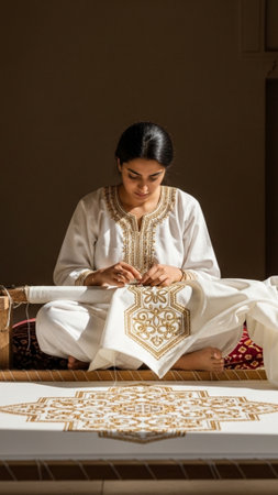 A full-body, high-angle vertical portrait of a dedicated Arab craftswoman preparing festive garments