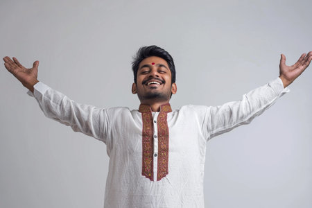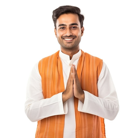Indian Man Doing Namaste, India Welcome Gesture, Indian Man in Traditional Clothing Meeting Guests Isolated on White Background, Generative AI Illustration