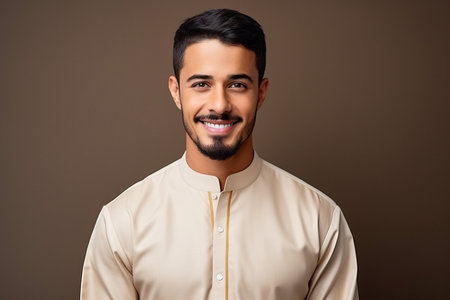 indian arab ith a happy and cool smile on face isolated on brown o background. portrait of lucky person, good mood