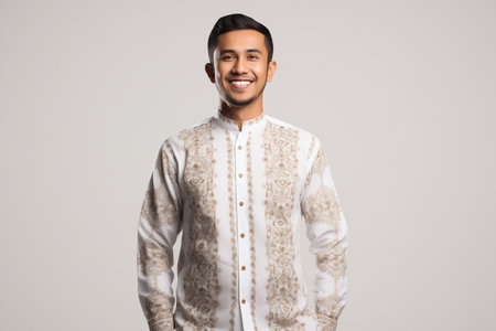 Youthful Muslim man standing on a white background, adorned with traditional Balinese motifs in a happycore style, captured with the vibrant energy of Provia film