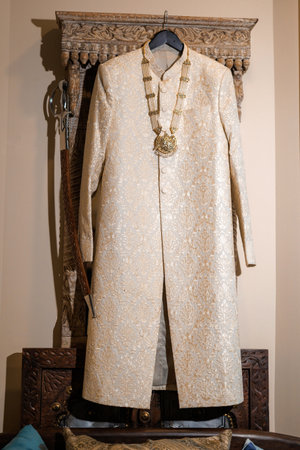 The Indian traditional outfit of the groom hangs on a hanger. An elegant patterned sherwani hangs above the bed in the groom's room. Prepared stylish Indian traditional men's wear for wedding