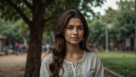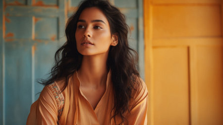 A young woman wearing a colorful sari with gold earrings and a smile on her face. Concept of happiness and positivity