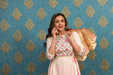 Beautiful young woman with shopping bags talking on the phone in the studio