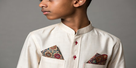 Young boy wearing traditional cream colored shirt with decorative pocket squares