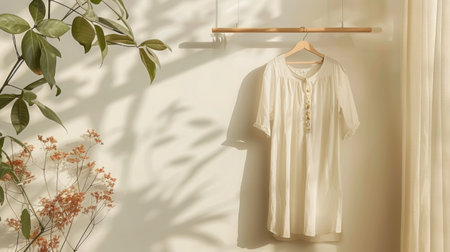 Photograph a unisex dress hanging on a clothes rack, emphasizing the design's simplicity and elegance against a minimalist background.