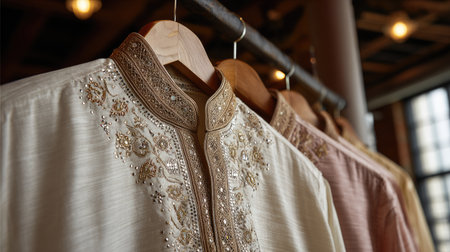 Discover a stunning display of traditional garments featuring exquisite embroidery and soft color palettes, highlighting the beauty of craftsmanship in fashion.