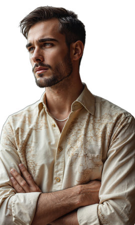 A graceful man in linen textures, arms folded with sandstorm lines tracing digital maps, symbolizing perseverance, nomadic brand flow