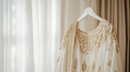 This image showcases an elegant traditional garment featuring intricate embroidery and delicate beadwork, hung gracefully in soft natural light.