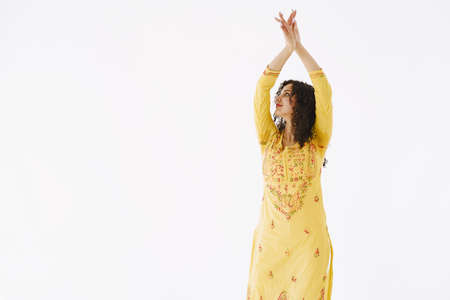 Young brunette indian man in traditional shirt standing in profile isolated over yellow background