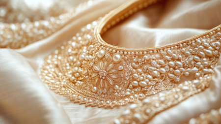 Close-up view of intricate golden embroidery featuring pearls on luxurious silk fabric. The detailed design showcases exquisite craftsmanship and elegance, perfect for fashion and decor.