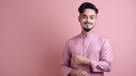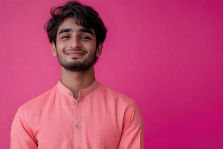 Young Indian man smiling to camera, wearing a traditional kurta, standing confidently against a vibrant pink background